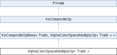 Inheritance diagram for AlphaColorSpaceMultiplyOp< Traits >:Public Member Functions | |
