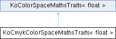 Inheritance diagram for KoCmykColorSpaceMathsTraits< float >:Static Public Attributes | |