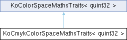 Inheritance diagram for KoCmykColorSpaceMathsTraits< quint32 >:Additional Inherited Members | |