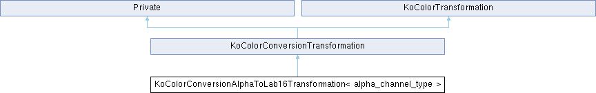 Inheritance diagram for KoColorConversionAlphaToLab16Transformation< alpha_channel_type >:Public Member Functions | |