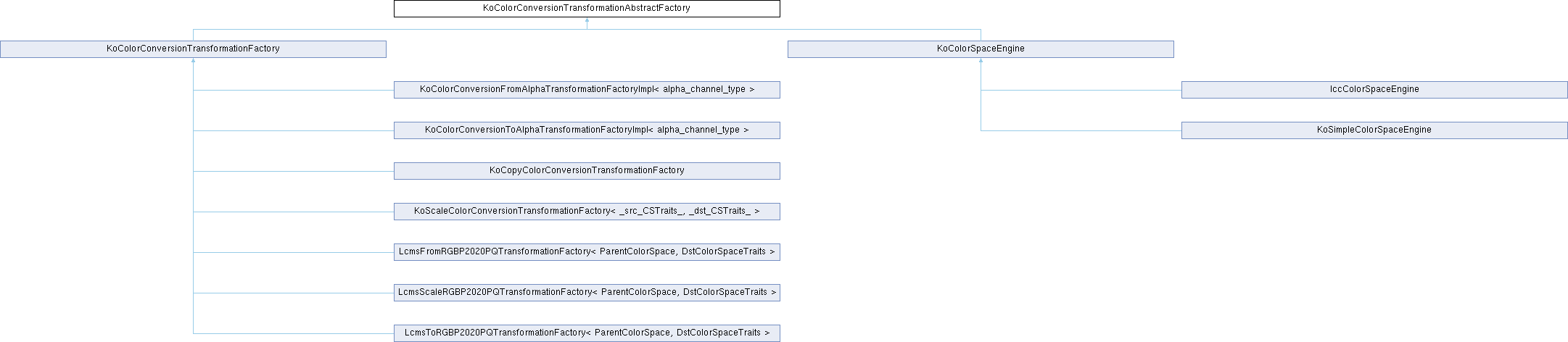 Inheritance diagram for KoColorConversionTransformationAbstractFactory:Public Member Functions | |