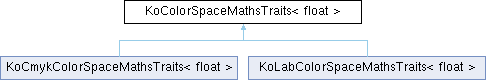 Inheritance diagram for KoColorSpaceMathsTraits< float >:Public Types | |