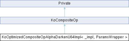Inheritance diagram for KoOptimizedCompositeOpAlphaDarkenU64Impl< _impl, ParamsWrapper >:Public Member Functions | |