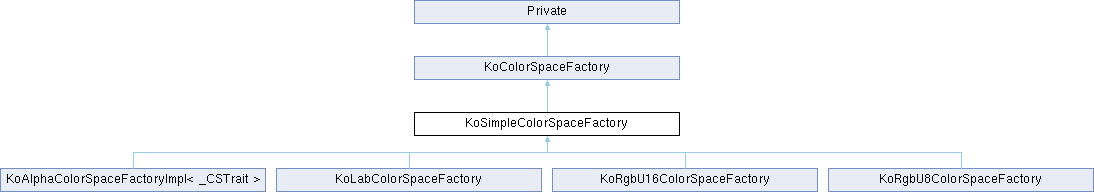 Inheritance diagram for KoSimpleColorSpaceFactory:Public Member Functions | |
