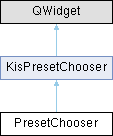 The PresetChooser widget wraps the KisPresetChooser widget. The widget provides for selecting brush presets. It has a tagging bar and a filter field. It is not automatically synchronized with the currently selected preset in the current Windows. More...