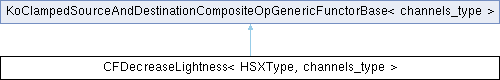 Inheritance diagram for CFDecreaseLightness< HSXType, channels_type >:Static Public Member Functions | |