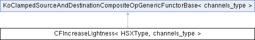 Inheritance diagram for CFIncreaseLightness< HSXType, channels_type >:Static Public Member Functions | |