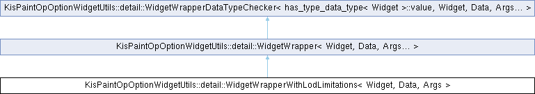 Inheritance diagram for KisPaintOpOptionWidgetUtils::detail::WidgetWrapperWithLodLimitations< Widget, Data, Args >:Public Types | |