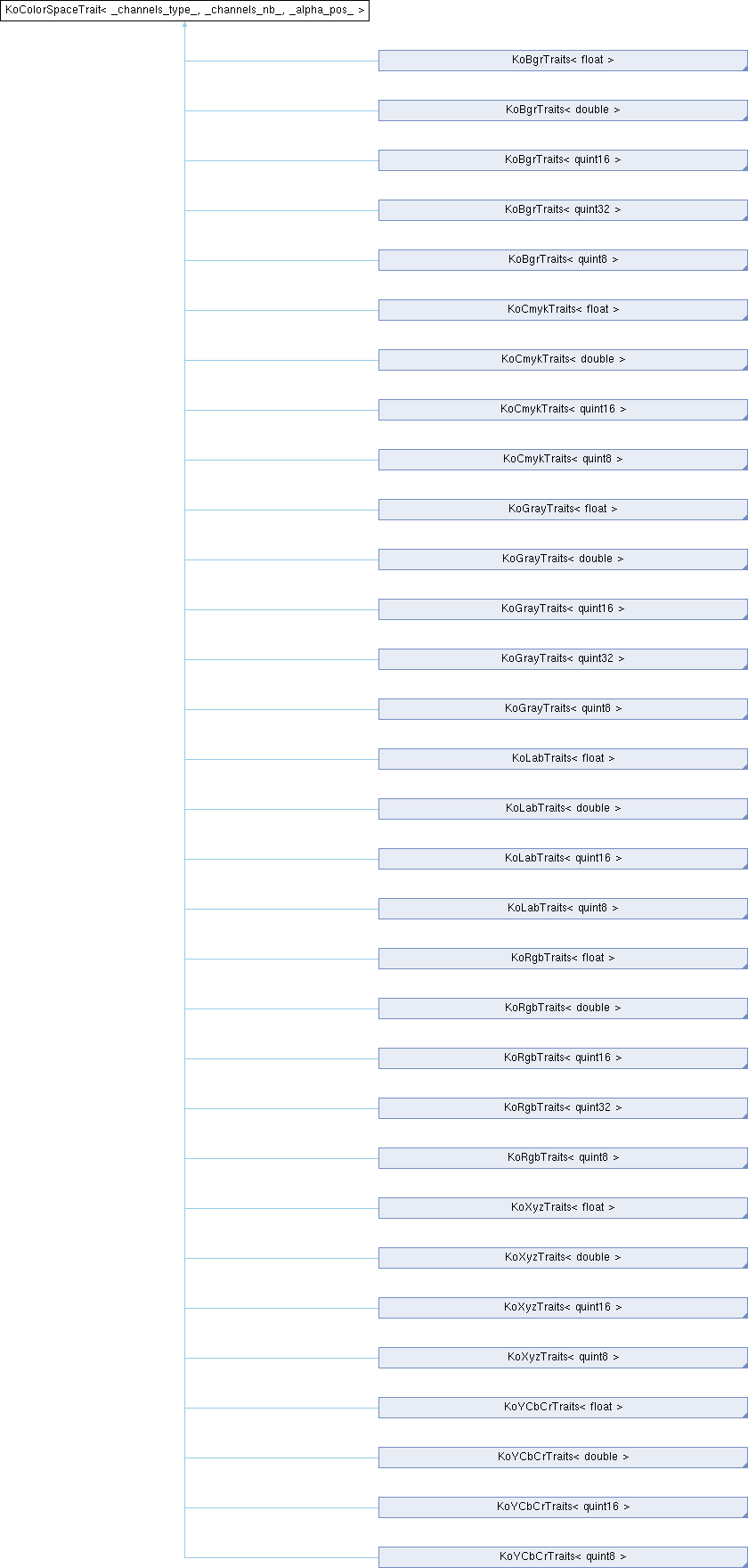 Inheritance diagram for KoColorSpaceTrait< _channels_type_, _channels_nb_, _alpha_pos_ >:Public Types | |